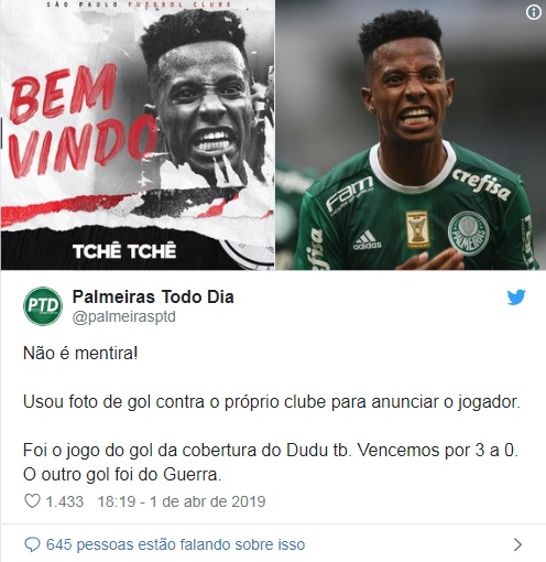 Как пишет Lance, фотография, использованная «Сан-Паулу» в новости, была сделана во времена выступлений Че Че за «Палмейрас», более того, сделана она была в тот момент, когда полузащитник забил гол… в ворота самого «Сан-Паулу»!