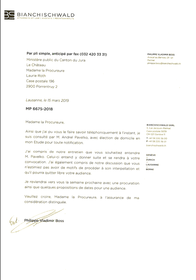 "Пане Павелко, в рамках відкритого проти Вас кримінального провадження за фактом погроз і спроб залякування просимо Вас як обвинуваченого з’явитись 4 квітня до прокуратури Поррентрюї". Це – пряма цитата з повістки до швейцарської прокуратури для глави бюджетного комітету ВР Андрія Павелка. Який тепер до всіх своїх численних посад додав ще й фігуранта у справі про погрози та залякування журналіста Арно Беда. Того самого, що викрив його багатомільйонні корупційні злочини.