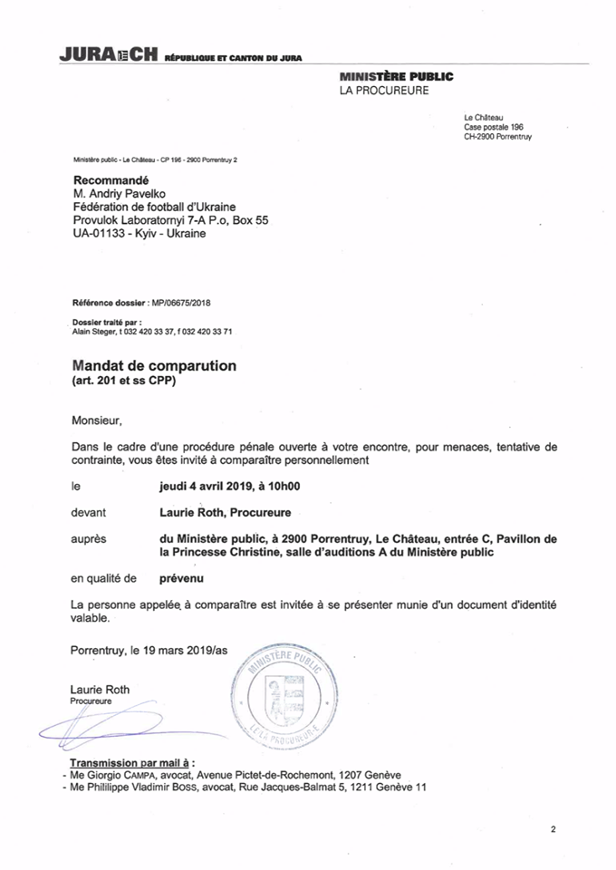 Прокуратура швейцарського міста Поррентрюї викликала президента Федерації футболу України Андрія Павелка у справі про погрози на адресу журналіста Арно Беда.