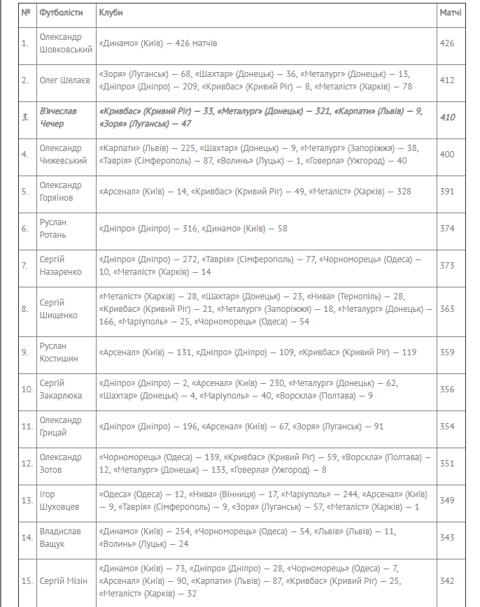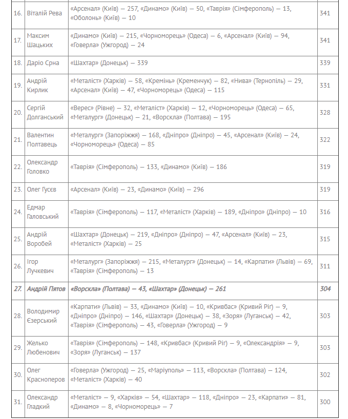Усі футболісти, які зіграли 300+ матчів у чемпіонаті України: