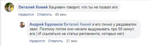 Руководитель медиа и PR донецкого «Шахтера» Андрей Бурлаков в комментарии под своим постом в Facebook утверждает обратное: «Я его (Хацкевича — прим. MatchDay.ua) лично у раздевалки звал. Поэтому потом они начали выдумывать про 50 минут, ага. И ссылаться на статьи регламента, которых нет».