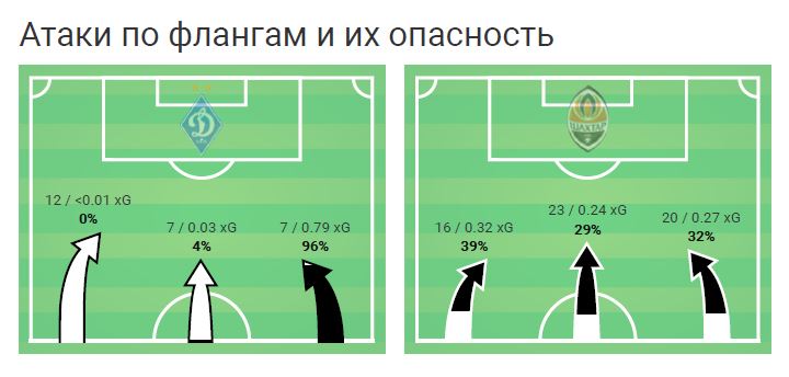 Любопытно также оценить географию атакующих посылов. Динамо чаще атаковало левым флангом, но острее получалось через правый. У Шахтера рейтинг выглядит так: центр, правый край, левый край, но по опасности впереди как раз левая бровка.