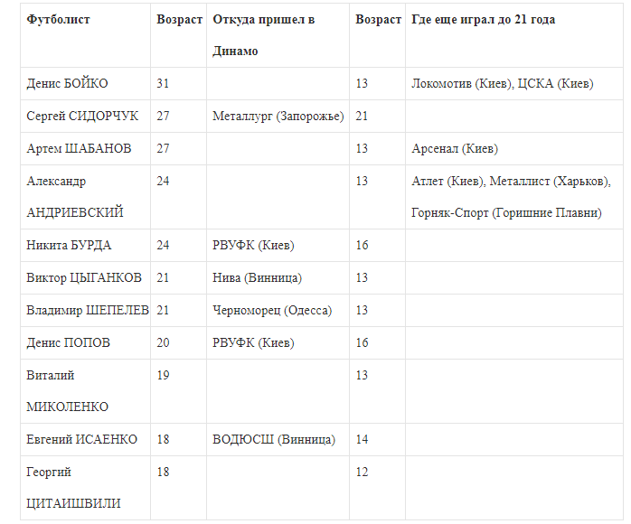 Ниже – таблица, в которой указан количество полных лет футболиста на данный момент, предыдущая команда, возраст дебюта за Динамо в чемпионате Украины (включая ДЮФЛУ), а также другие команды, за которые играл футболист уже после дебюта в Динамо.