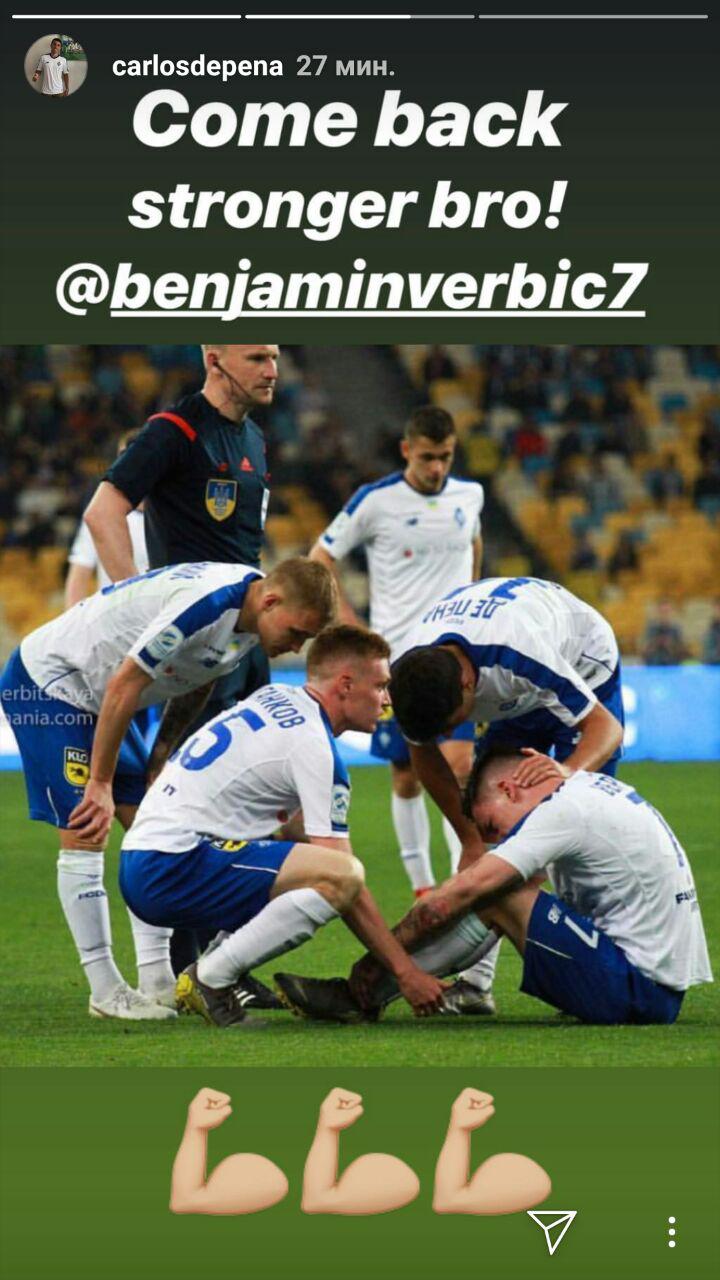 Новичок "Динамо" Карлос де Пена в своем Instagram поддержал Беньямина Вербича, который из-за повреждения не смог продолжить игру с "Шахтером".