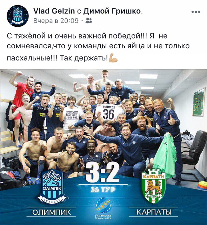 "С тяжелой и очень важной победой! Я не сомневался, что у команды есть яйца, и не только пасхальные! Так держать!" - написал Гельзин на своей страничке в Фейсбуке.