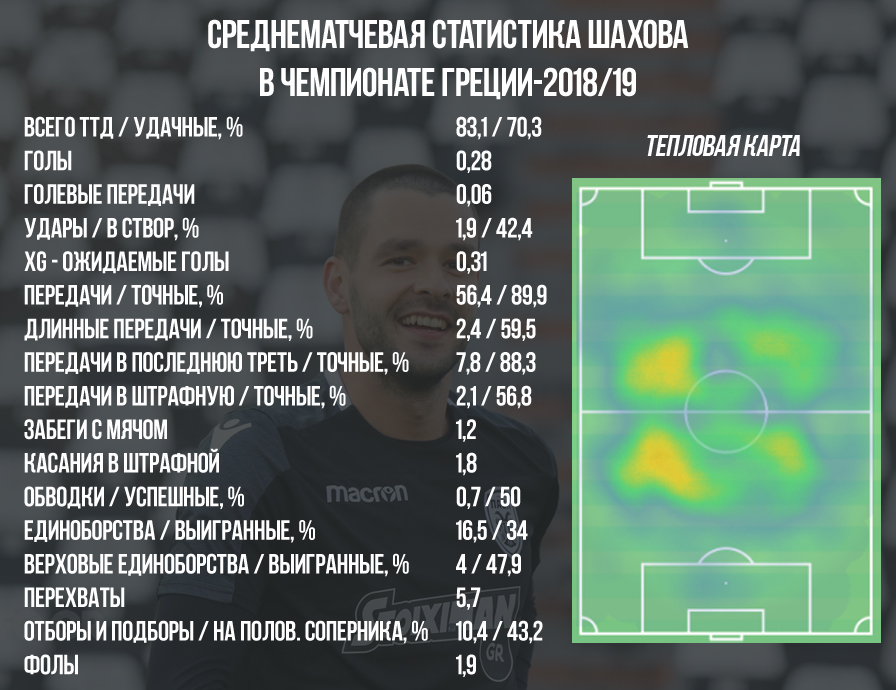 Шахов – футболист, который не склонен рисковать на поле. Он предпочитает действовать максимально осторожно и аккуратно. За счет этого в его игре зачастую нет какой-либо «искры», однако со своими обязанностями хавбек справляется уверенно. Главная задача Евгения в ПАОКе при организации атак своей команды – снабдить точной передачей более креативных партнеров. С этим самым первым пасом у Шахова особых проблем нет – 82% его передач, которые направлены вперед, являются точными, а по пасам в последнюю треть поля статистика еще лучше – 88,3% таких передач находят партнера украинца по команде.