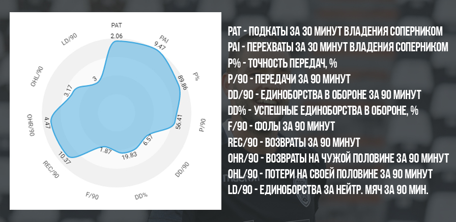 Хорошо оценить среднюю картину действий Шахова на поле позволяет его радар. На нем четко видны лучшие со статистической точки зрения качества футболиста – игра в подкатах, на перехватах мяча, хорошая культура паса. Также здесь отслеживается и нежелание рисковать, выражаемое в высоком показателе возвратов мяча, в том числе и на половине поля соперника.