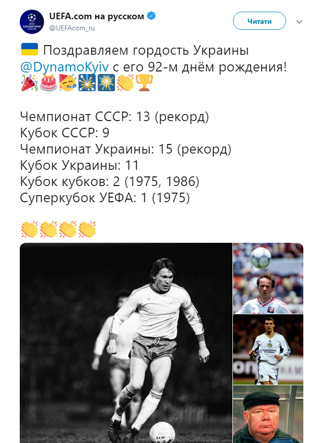 УЕФА поздравил киевское "Динамо" с днем основания.