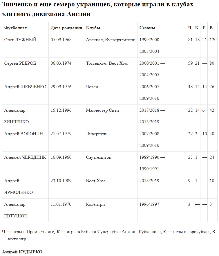 В любом случае наш представитель в составе чемпиона Англии имеет новые ориентиры. Андрей Шевченко в Челси провел 76 поединков. Сергей Ребров в Тоттенхэме и Вест Хэме — 80. Обоих вполне реально обойти за год, если повышать количество своего игрового времени. А вот для рекорда Олега Лужного (120) еще нужно созреть.