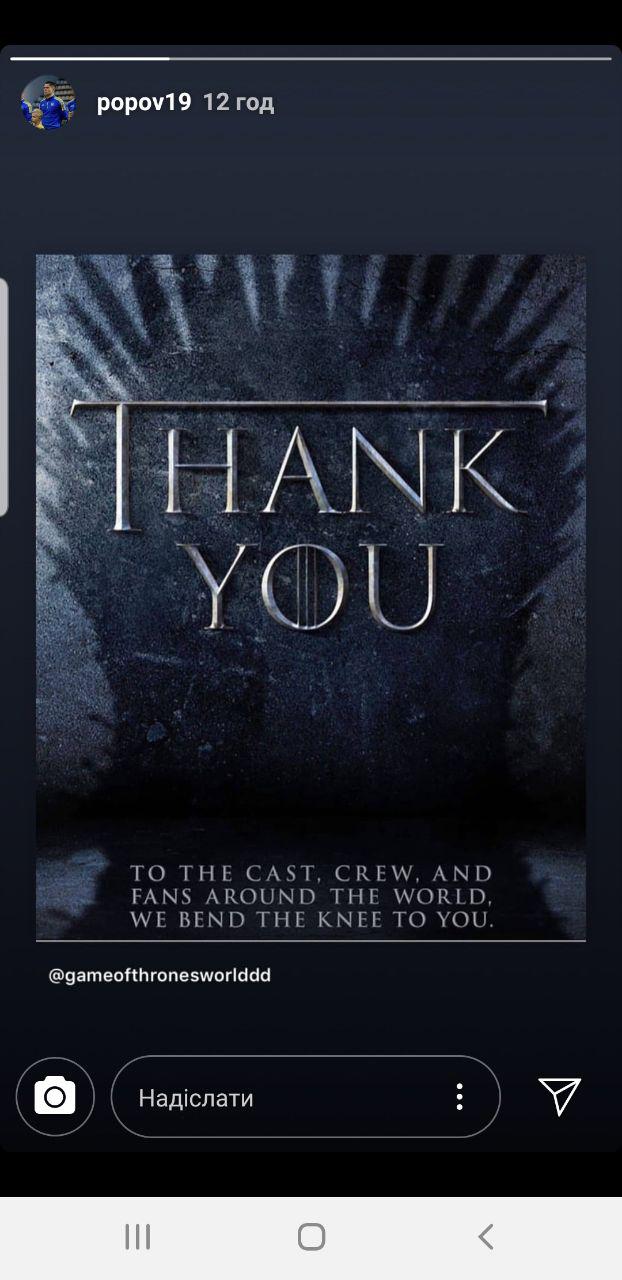 Защитник "Динамо" Денис Попов в своем Instagram поделился текстом с благодарностью создателям популярного сериала "Игра престолов", последняя серия которого вышла на днях.