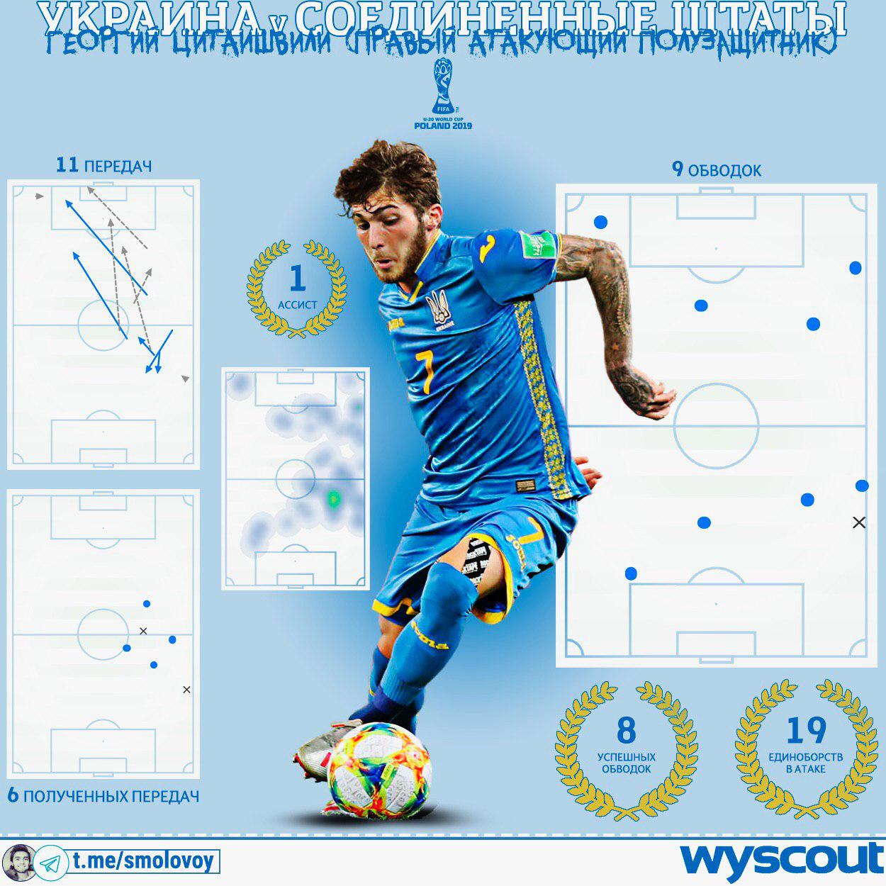 Блогер Михаил Смоловой в своем Telegram-канале рассказывает о том, как вингер "Динамо" Георгий Цитаишвили сыграл за сборную Украины U-20 в матче ЧМ-2019 против США.