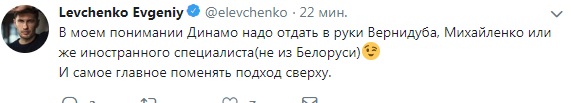 - В моем понимании Динамо надо отдать в руки Вернидуба, Михайленко или же иностранного специалиста (не из Беларуси) И самое главное поменять подход сверху, - написал Левченко на своей странице в Твиттере.