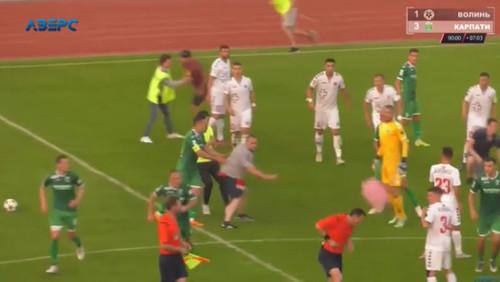 В матче за право играть в УПЛ между «Волынью» и «Карпатами» (1:3, второй тайм) на поле произошел инцидент между фанатами хозяев и главным арбитром Максимом Козыряцким.