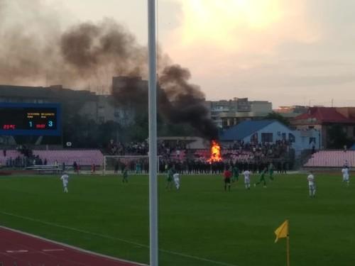 Футбольные фанаты развели костер на стадионе «Авангард» во время переходного матча за путевку в Премьер-лигу между луцкой «Волынью» и львовскими «Карпатами» (1:3).