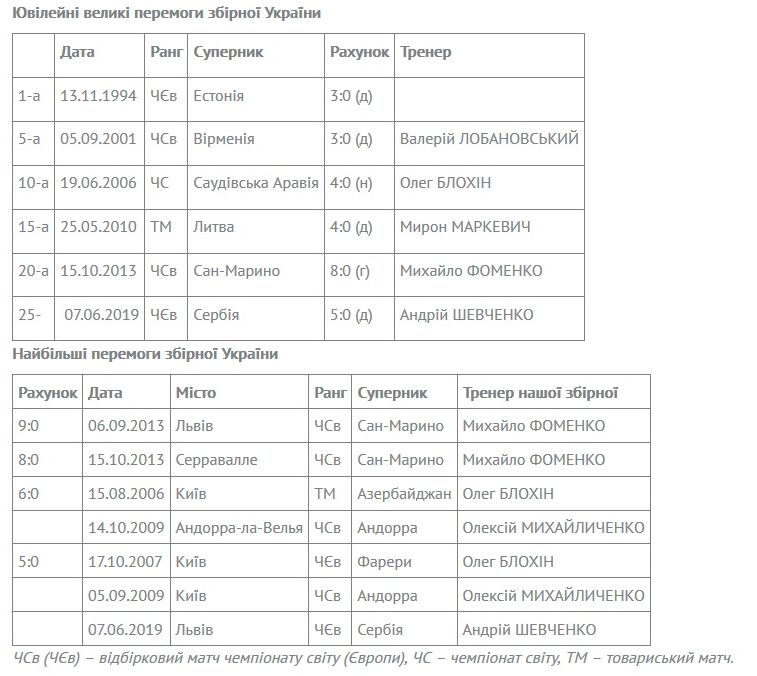У Львові збірна України, розгромивши збірну Сербії з рахунком 5:0, здобула 25-ту велику перемогу в своїй історії. 10 разів наша збірна громила суперників у товариських матчах, 6 – у чемпіонатах Європи та 9 – у чемпіонатах світу. 15 разів головна команда країни перемагала суперників на своєму полі, 6 – у гостях і 4 – на нейтральних полях. До речі, «вікторія» над сербами після 12-річної перерви стала повторенням найбільшої перемоги синьо-жовтих в рамках чемпіонатів Європи.
