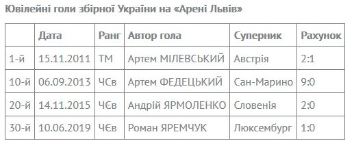 Роман Яремчук, провівши гол у ворота збірної Люксембургу, став автором 30-го м’яча «синьо-жовтих» саме на «Арені Львів», а збірна України здобула ювілейну, 10-ту, перемогу на цьому стадіоні.