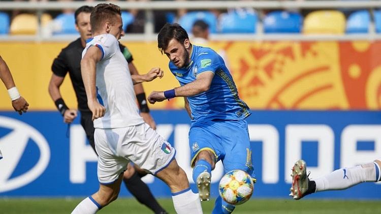 Емоції Олександра Петракова – головного тренера збірної України з футболу U-20 та автора вирішального голу в 1/2 фіналу – Сергія Булеци після перемоги над збірною Італії.