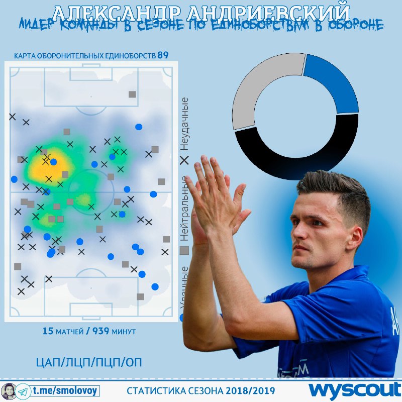 Тепловая карта даёт представление о доминирующей позиции - ЛЦП. Даже Буяльский смещался с неё на правую половину поля. Ну, а после травмы Виталия уже никто не мог Андриевского подвинуть. Были отрезки на позиции АП, были периоды и в роли «нижнего» хава. В общем весь диапазон.