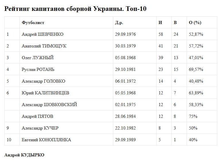 А на данный момент Пятов — уникальный капитан. Он — лучший по проценту набранных очков среди футболистов, которые более трех раз выводили сборную Украины на поле с капитанской повязкой. Эта статистика, разумеется, может измениться в обе стороны. Второй в этом рейтинге — Руслан Ротань.