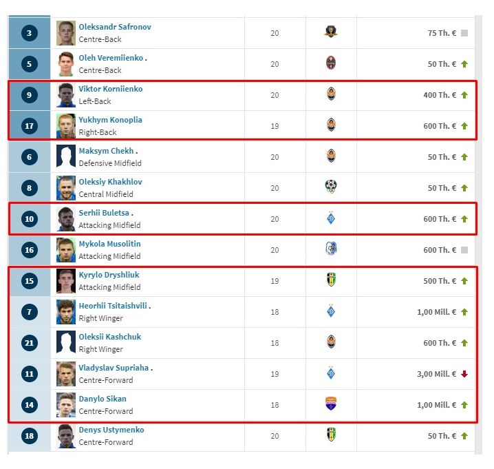 Мільйоном може похвалитися і 18-річний Данило Сікан, який грає в оренді у Маріуполі, але належить Шахтарю. Нападник продемонстрував хорошу результативність на Чемпіонаті Світу у Польщі, відзначившись 4-ма голами у 6-ти матчах. До турніру він коштував 200 тисяч євро.