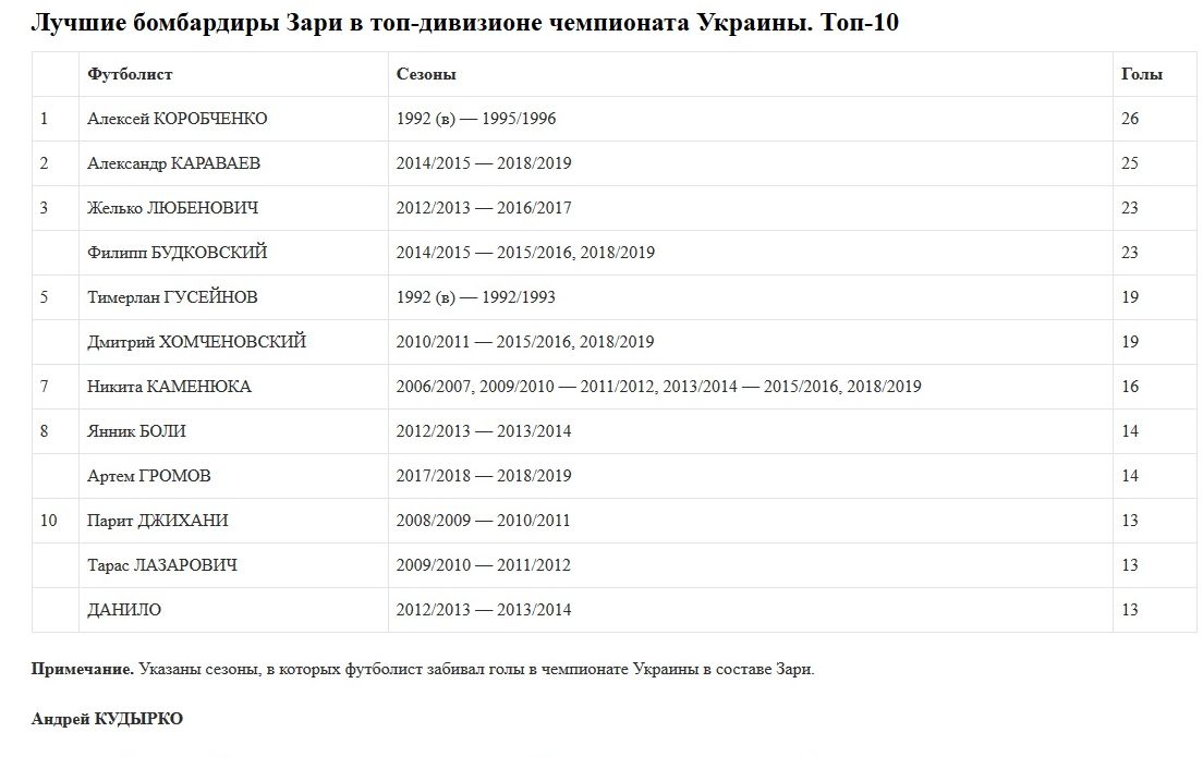 Кто же лидер? Болельщики со стажем с ходу предполагают, что это Тимерлан Гусейнов — знаменитый снайпер ЧУ в 1990-х, именем которого назван клуб украинских бомбардиров, забивших на официальном уровне 100 и больше мячей. Но нет, Гусейнов за Зарю (в первой половине 1990-х — Зарю-МАЛС) забил только 19 голов, а летом 1993 года ушел в Черноморец. Там и развернулся на полную катушку.