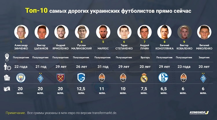 Весь июнь специалисты авторитетного немецкого портала transfermarkt.de обновляли стоимость футболистов, выступавших в европейских лигах в сезоне-2018/2019. Коснулась переоценка и большинства украинских футболистов. Верхушка нашего айсберга перед вами.