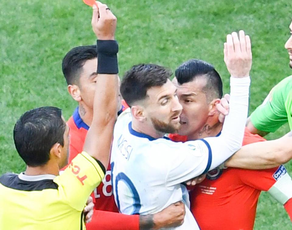 Форвард аргентинцев Лионель Месси был удален на 37-й минуте встречи за драку с защитником чилийцев Гари Меделем. Последний также получил прямую красную карточку.