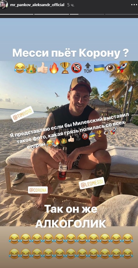 - Месси пьет Корону? Я представляю, если бы Милевский выставил такое фото, какая грязь полилась бы со всех сторон. Так он же АЛКОГОЛИК, - написал Панков.