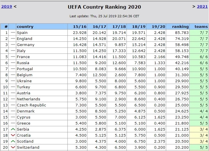 Країна, яка за підсумками єврокубкової кампанії 2019/20 посяде 7-9-ту позицію в рейтингу асоціацій УЄФА, у сезоні 2021/22 отримає право делегувати у європейські клубні змагання 5 представників, з них двох – у Лігу чемпіонів (одного – одразу в груповий турнір, а ще одного – в 3-й кваліфай-раунд).