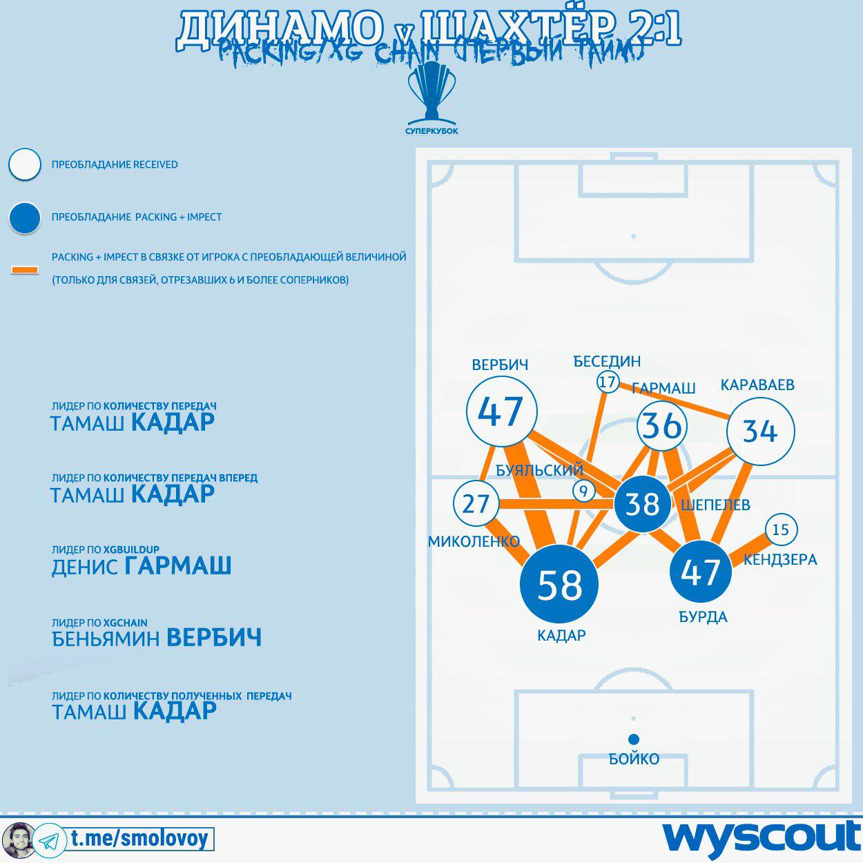 Гармаш выполнил предпоследнюю передачу на Караваева в моменте с ударом Вербича (27’). Так ему и досталось 0.29 баллов в xGBuildUp.
