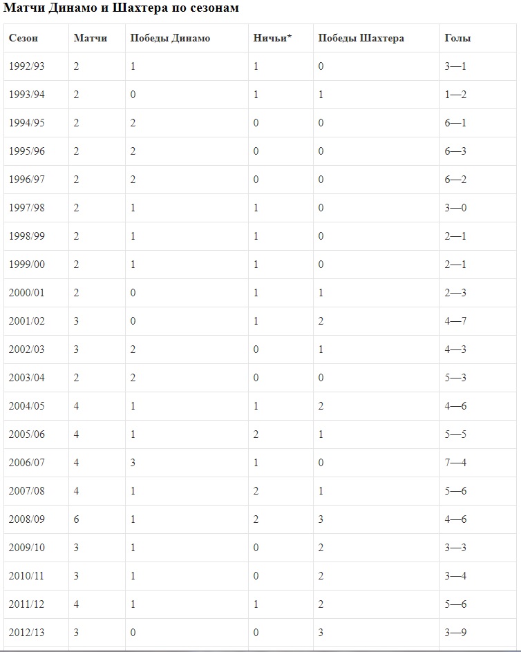 В предыдущих 27-ми сезонах оппоненты проводили от двух очных матчей до шести. В четырех случаях все поединки выигрывало Динамо, в двух — Шахтер. У киевлян было пять сезонов без побед, а у горняков — девять. Если суммировать количество очков, то бело-синие и оранжево-черные уделывали друг друга по 12 раз, а еще трижды фиксировалась «ничья».