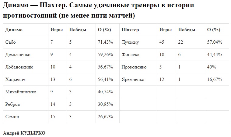 Ниже — показатели тренеров двух клубов в очных противостояниях. Выбраны специалисты, которые провели в главном украинском дерби не менее пяти матчей. Правда, при этом у Шахтера за кадром остался Невио Скала, который имеет идеальные показатели. Итальянец выиграл все три матча у Динамо с общим счетом 6:2. Напомним, что именно он впервые сделал горняков чемпионами Украины.
