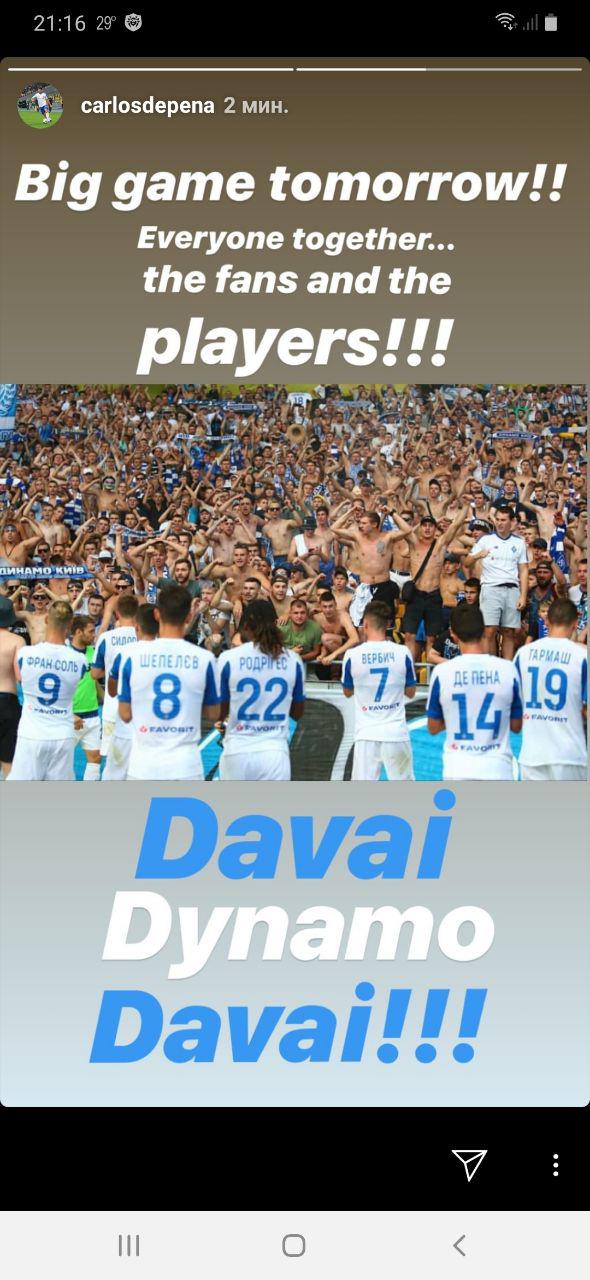 "Завтра большая игра. Все вместе - фанаты и команды". Давай, "Динамо", давай", - написал уругваец в своем Instagram.