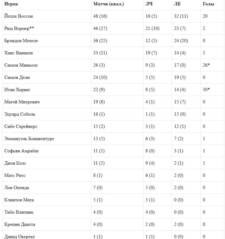Сразу 11 игроков выступали в еврокубках и за другие команды. Это Воссен (Генк), Вормер (АЗ, Фейеноорд), Ванакен (Локерен), Миньоле (Ливерпуль), Соболь (Заря, Славия, Яблонец), Симон Дели (Славия), Итан Хорват (Мольде), Матей Митрович (Риека, Бешикташ), Сибе Схрейверс (Генк), Эммануэль Бонавентуре (Заря), Софьян Амрабат (Фейеноорд).