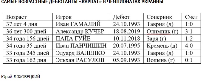 В поединке с «Олимпиком» первый матч за «Карпаты» в чемпионатах Украины в возрасте 36 лет 300 дней провел Александр Кучер. Более поздний дебют в рядах львовян имел только Иван Гамалий, который 24 октября 1993 года в 37 лет 4 дня впервые сыграл за зелено-белых против «Таврии» (1:0).