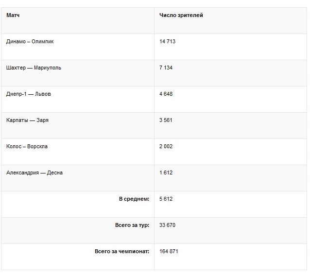 Впрочем, число зрителей в этом туре более, чем в два раза превышает худший показатель нынешней УПЛ – в 4-м туре (без учета матча Динамо – Мариуполь) на трибунах клубов УПЛ собрались только 15 548 зрителей.