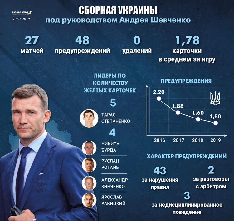 В 27-ми матчах сборной Украины, сыгранных под руководством Андрея Шевченко, футболисты нашей команды ни разу не удалялись с поля и заработали всего 48 предупреждений – в среднем было меньше двух карточек за игру. Примечательно, что с каждым годом число наказаний арбитров уменьшается, при этом за нарушение дисциплины и разговоры с рефери сине-желтые получили только пять горчичников (остальные носили сугубо игровой характер). Три из них – в самом начале работы Андрея Шевченко.