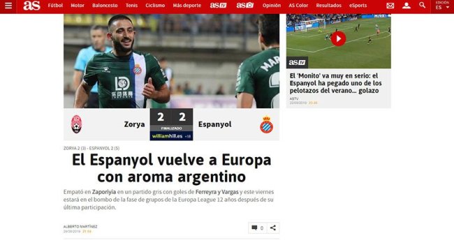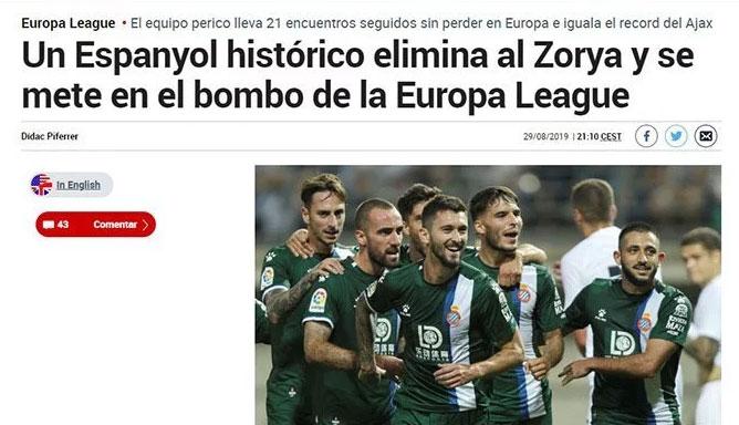"Эспаньол" возвращается в Европу с аргентинским ароматом" – так озаглавил статью автор As Альберто Мартинес, впечатленный игрой "Зари", но неприятно пораженный запорожским городским пейзажем.