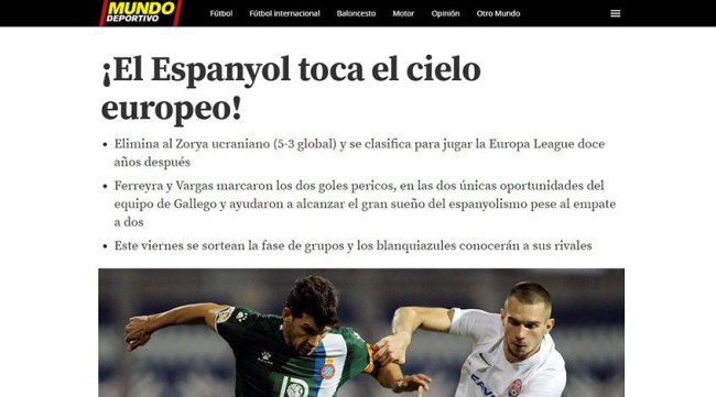 "В старом и индустриальном Запорожье, где запах сгоревшей резины пронизывает воздух, перенося вас в другую эпоху, "Эспаньол" оформил выход в групповой раунд Лиги Европы 12 лет спустя. Команда Гальего, по сути, сыграла хорошо только 45 из 180 минут с удивительной "Зарей", во втором тайме первого матча, в ходе которого они забили три мяча. Тогда-то и был решен исход противостояния…", – отмечает Мартинес.