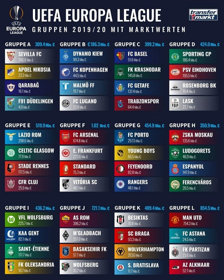 После вчерашней жеребьевки группового раунда Лиги Европы сезона-2019/2020 авторитетный портал transfermarkt.de опубликовал таблицу стоимости составов участников турнира.