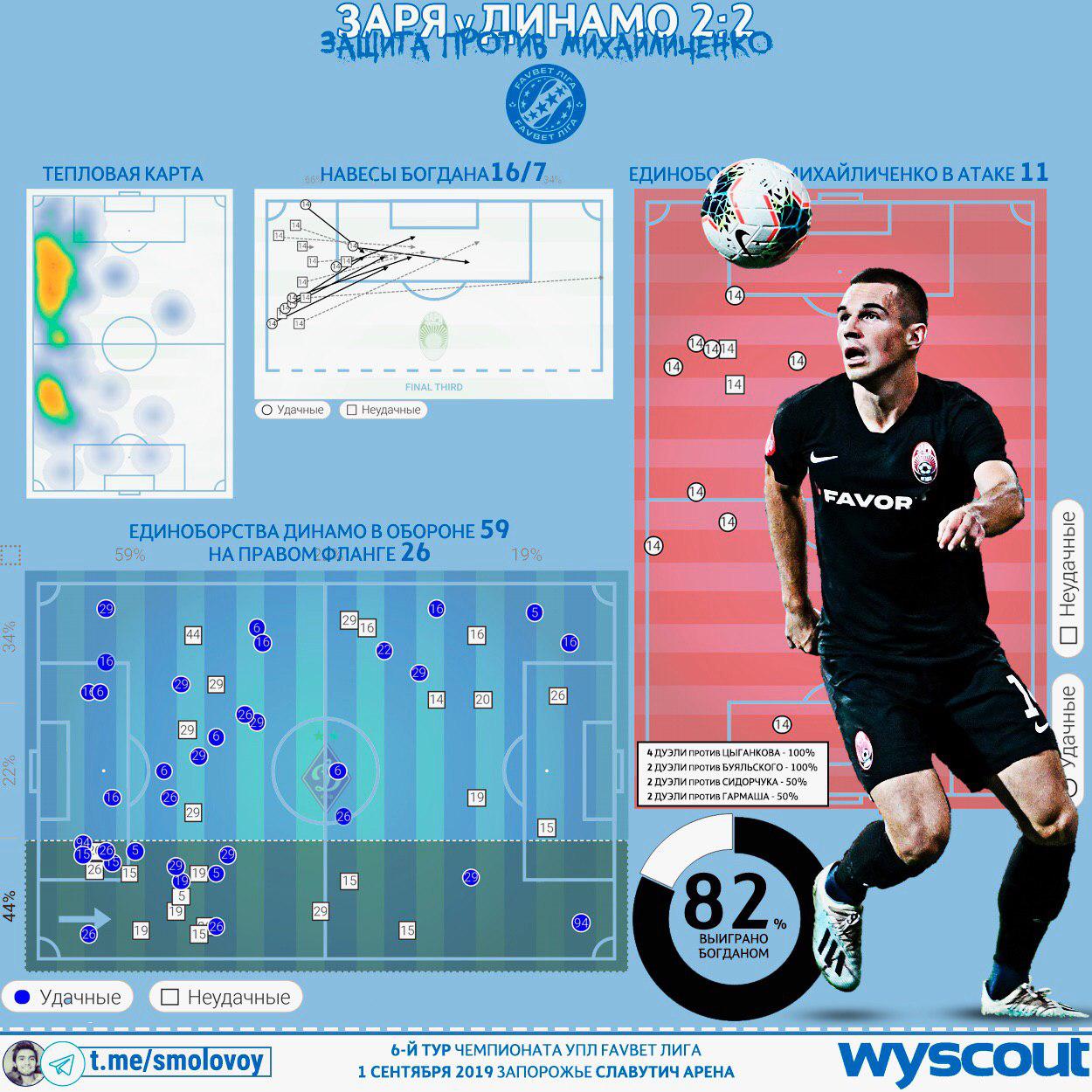 Блогер Михаил Смоловой в своем Telegram-канале анализирует игрк экс-динамовца Богдана Михайличенко за "Зарю" в матче против "Динамо".