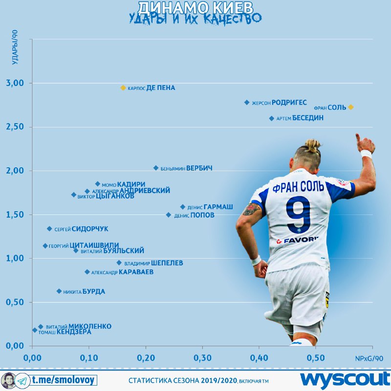 Карлос Де Пена - самый бьющий футболист Динамо, начиная с австрийских сборов (2.95/90). Но вот голевое ожидание не наивысшее - 0.16/90 xG. Правда, это, например, не помешало забить прекрасный гол Львову.