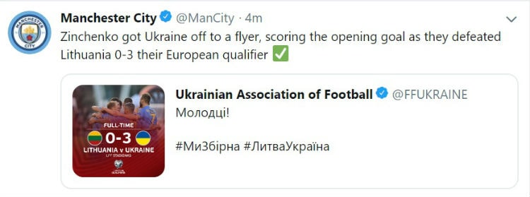 И Манчестер Сити, и Аталанта поздравили своих украинских футболистов с успехом.