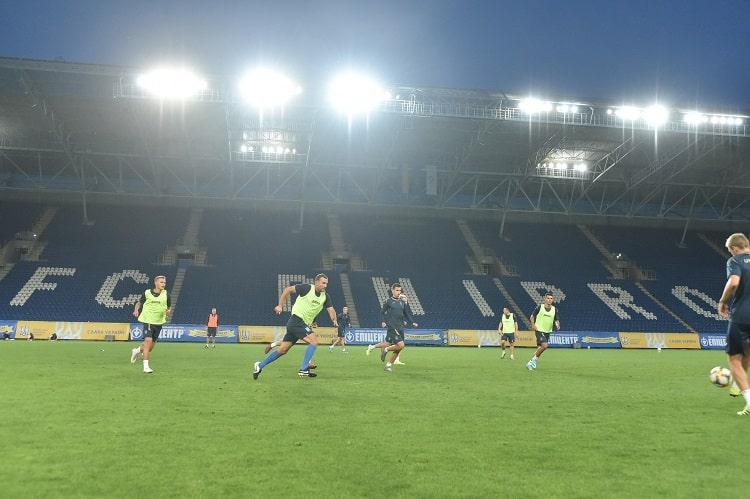 Щойно розмістившись у готелі «Аксельхоф», тренери та футболісти встигли перекусити й одразу ж вирушили на вечірнє тренування, що відбулося на «Дніпро-Арені». Тренерський штаб розділив 24-х гравців на дві групи. Хлопці, які вчора вийшли зі стартових хвилин, виконали набір відновлювальних вправ, запропонованих тренером із фізпідготовки Іваном Баштовим. Решта збірників, у тому числі ті, які вийшли в Литві на заміну, мали інтенсивне заняття з тактичними завданнями.