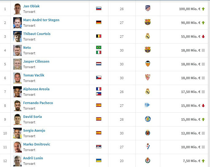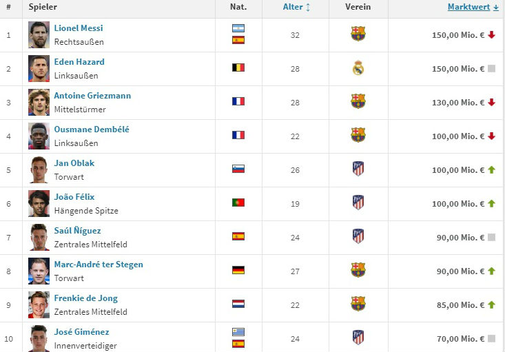 Авторитетный портал transfermarkt.de обновил информацию по стоимости футболистов, выступающих в испанской Ла Лиге.