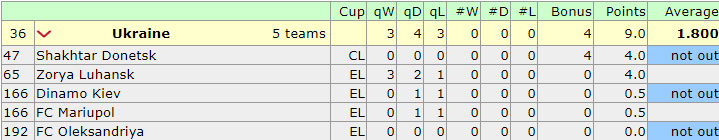 Станом на сьогодні українські клуби набрали цього року 9 очок (по 4 "Шахтар" і "Зоря", по 0,5 "Динамо" і "Маріуполь", "Олександрія" ще не вступала у боротьбу), що перетворилося у 1,8 бала загалом для країни.