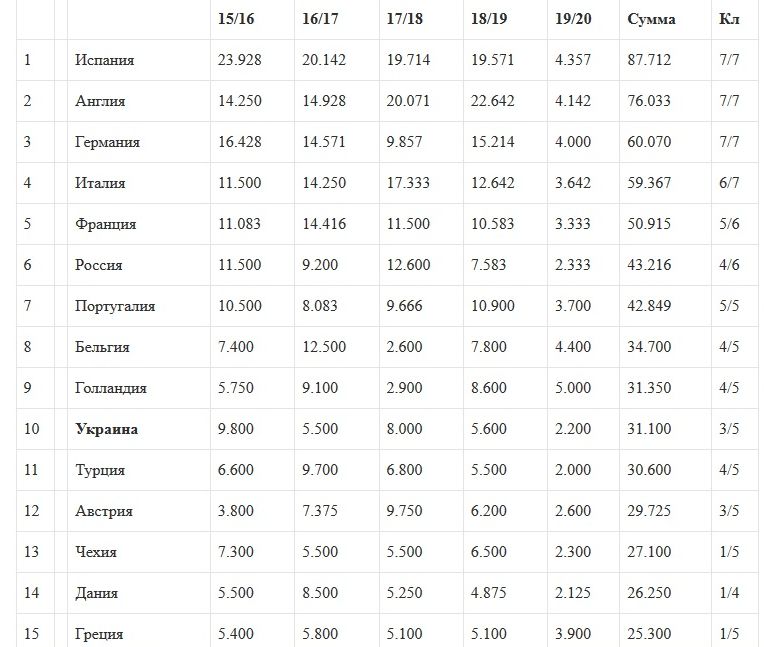 Тем не менее, улов киевлян не спас нас от падения на 10-е место в реестре. Голландия, которая имеет второй коэффициент в этом сезоне (5,000), за мид-уик разбогатела на 1,0 балл и впервые за многие годы обошла Украину в таблице. Столько же на этой неделе набрали и бельгийцы, которые оторвались от нас уже на 3,6 балла (18 очков или 9 побед)!