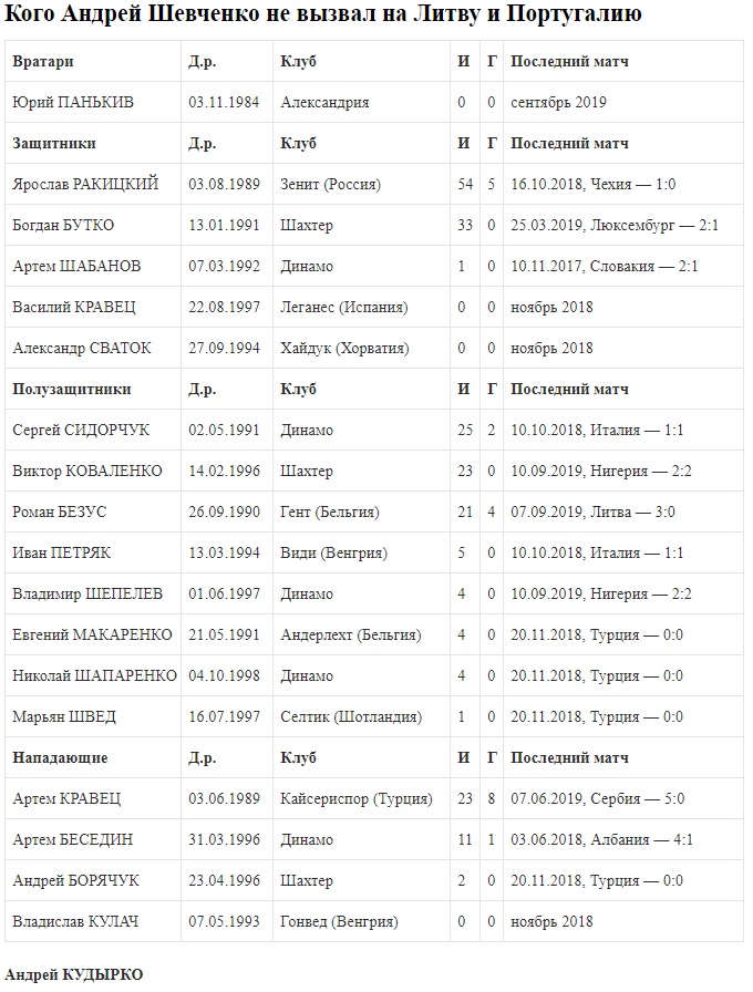 В состав сборной Украины на матчи отбора Евро-2020 с Литвой и Португалией не попала большая группа футболистов, которые на протяжении последних 12-ти месяцев входили в расширенный список национальной команды. Входили — это или играли, или вызывались, начиная с октября 2018 года.