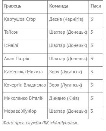 Віддавши три результативні передачі в матчі з «Маріуполем», крайній півзахисник «Десни» Єгор Картушов опинився на вершині таблиці асистентів Favbet Ліги. Взагалі це рідкість — асистентський хет-трик. Завдяки йому чернігівець випередив традиційних лідерів відповідної таблиці — футболістів «Шахтаря». Інший цікавий момент — серед динамівців Києва найбільше асистів має крайній захисник Миколенко.