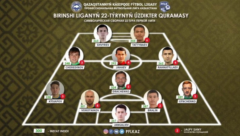 Профессиональная футбольная лига Казахстана попубликовала на своем официальном сайте символическую сборную 22-го тура Первой лиги. В нее попал украинский хавбек "Кызыл-Жар СК" Максим Драченко.
